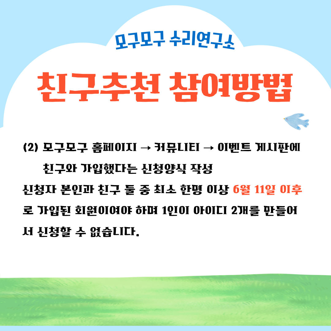 신청자 본인과 친구 둘 중 최소 한명 이상 6월 11일 이후로 가입된 회원이여야 하며 1인이 아이디 2개를 만들어서 신청할 수 없습니다.