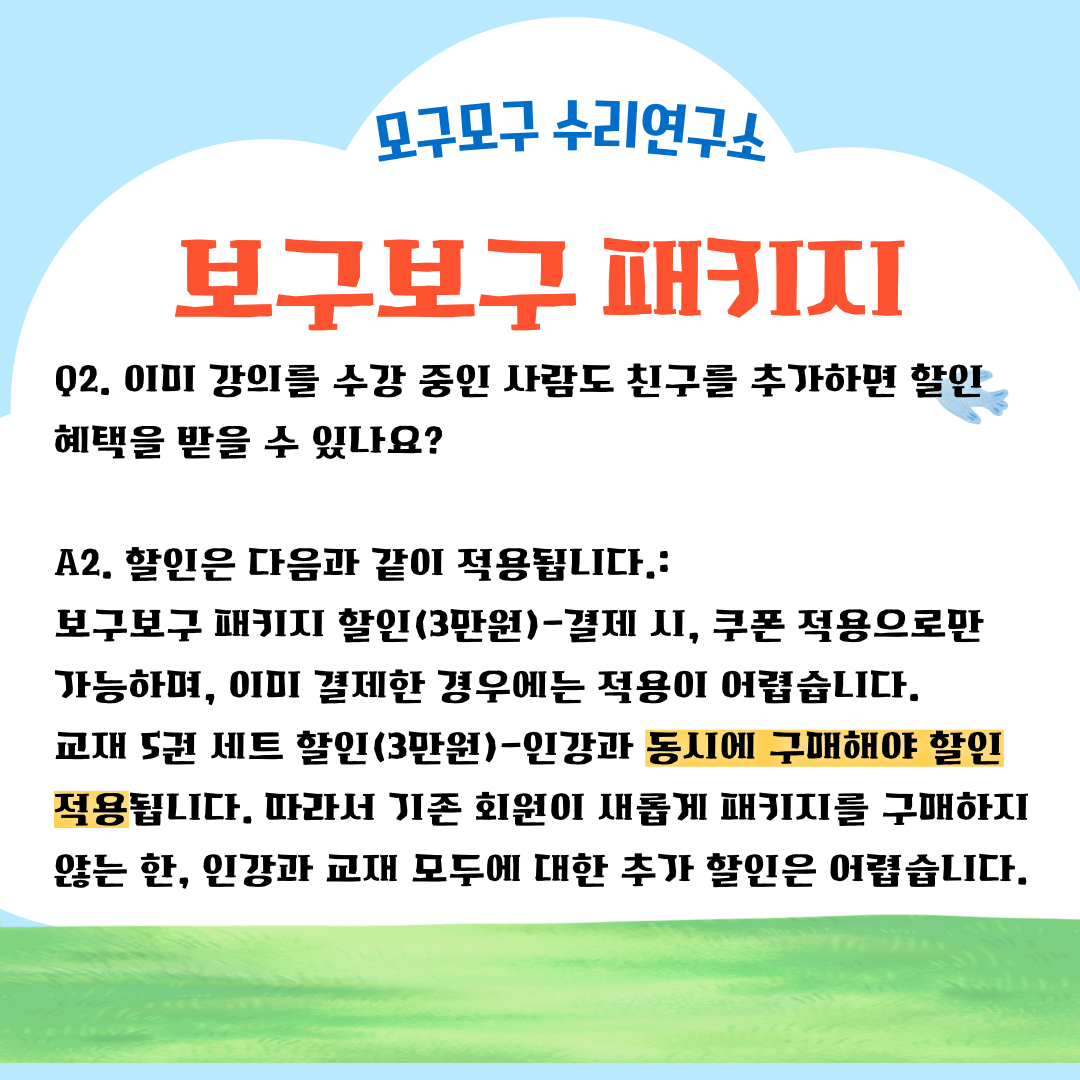 따라서 기존 회원이 새롭게 패키지를 구매하지 않는 한, 인강과 교재 모두에 대한 추가 할인은 어렵습니다.